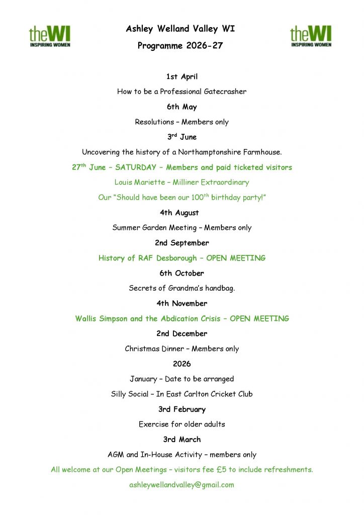 Suzi’s talk starts at 8pm and ithere’s a £5 fee for non-members. Non-members are also welcome to come along a bit earlier at 7.30pm for the WI General meeting. This is a great opportuity to find out a bit more about your local WI and what they get up to! April is the start of the WI’s new year, so if you join now, you’ll make the most of your £54 membership fee! You can find a full programme of events below, and online at Ashleyvillage.co.uk.