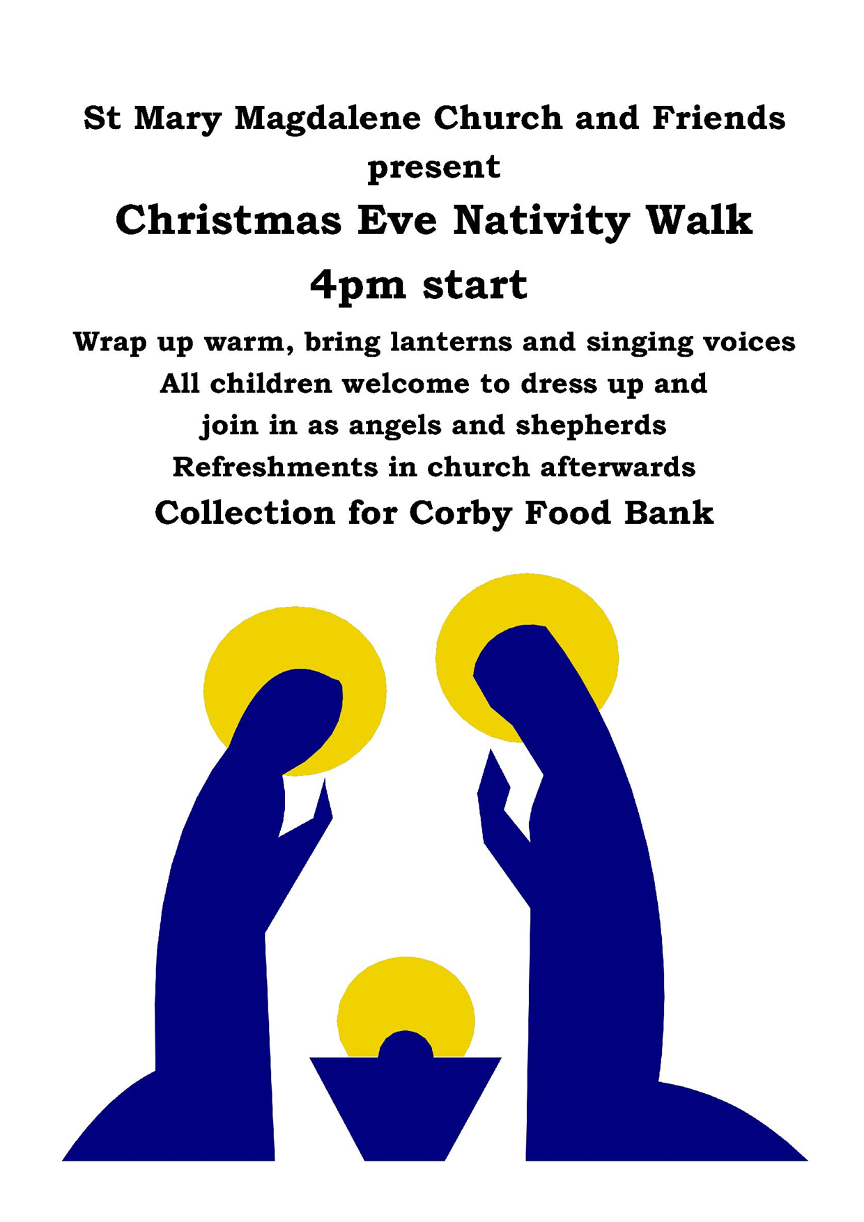 Join Joseph and Mary on their journey to the stable. The route is currently being finalised, but we’ll walk through the village streets, finishing at the church where there’ll be a collection for Corby Food Bank. Please wrap up warm...