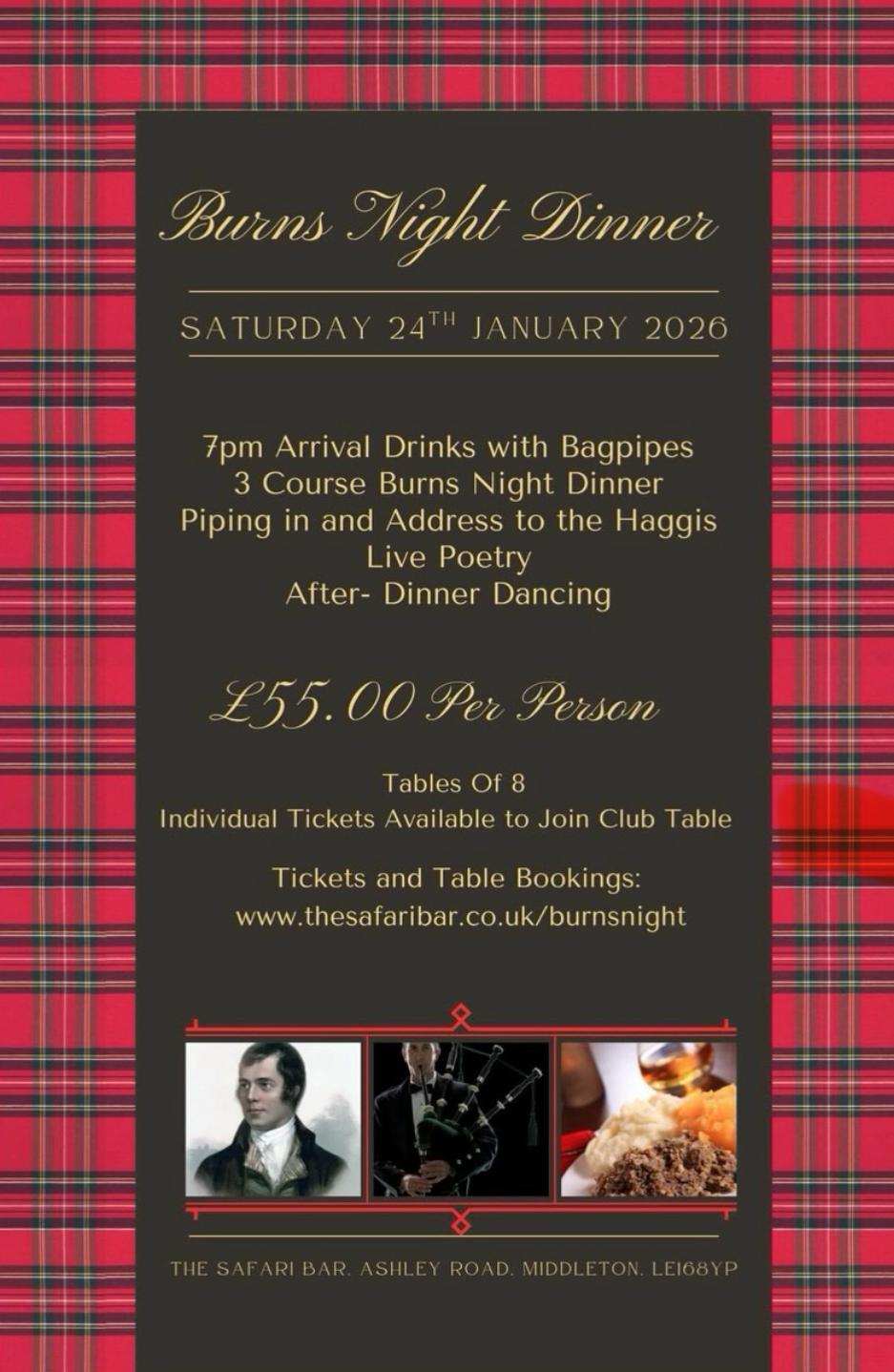 VO Polo Club Ashley Road, Middleton, Market Harborough, United KingdomAn unforgettable evening celebrating the life and legacy of Robert Burns! 🎉 What’s Included: * 7pm arrival drinks accompanied by live bagpipes * A traditional 3-course Burns Night dinner * Piping in and Address to the Haggis * Live poetry...