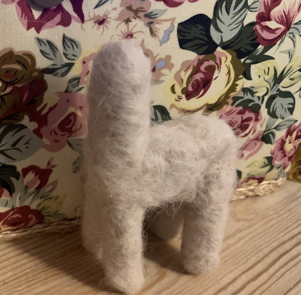 Pieces of fleece are then rolled and ‘needle-felted’ into shapes to make the body parts, using special barbed needles that are prodded through the fibres to knit them together. The 7 separate pieces (4 legs, 1 body, 1 neck and a nose) are then felted together, before longer combed sections of the fleece are laid over the top to give the mini alpaca his lovely soft coat. Finally, we add the faces (using merino wool), 2 ears, a tail and each alpaca’s characteristic topknot/fringe. And we’re done!
