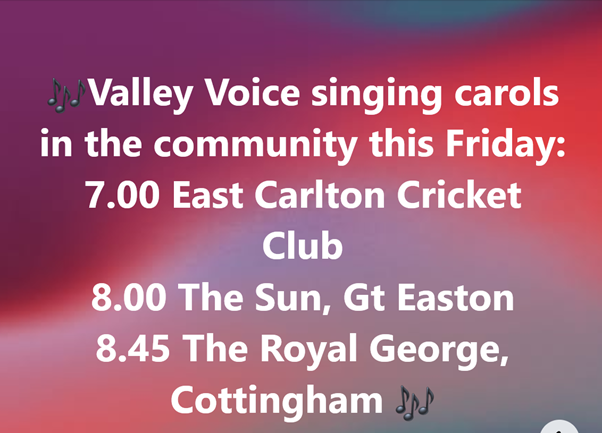 The Valley Voice Choir will be out and about in our community this Friday singing carols, collecting for Lakelands Hospice, Corby, and the local Air Ambulance.